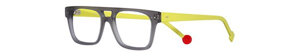 Sabine Be – be dandy. Un frontale in acetato grigio traslucido in contrasto con le aste in metallo giallo effetto opaco. Non mancano gli iconici terminali asimmetrici