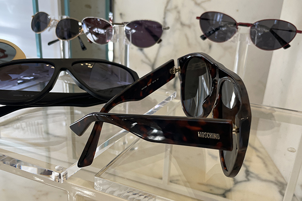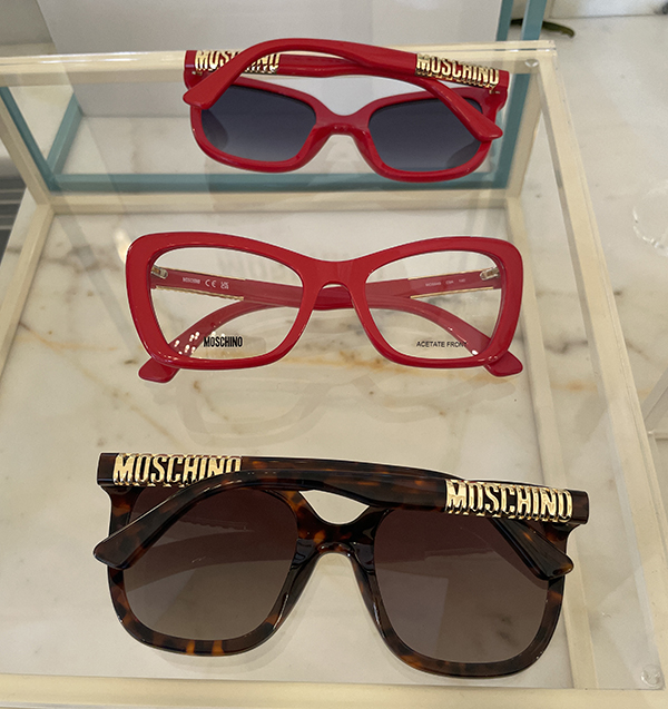 Nella linea femminile, il logo Moschino Bracelet avvolge l’asta come un elegante braccialetto, un dettaglio raffinato che arricchisce l’occhiale senza appesantirne l’estetica. Accanto a queste proposte, troviamo montature piccole e leggere in metallo, con forme cat-eye femminili che aggiungono un tocco di grazia e leggerezza.