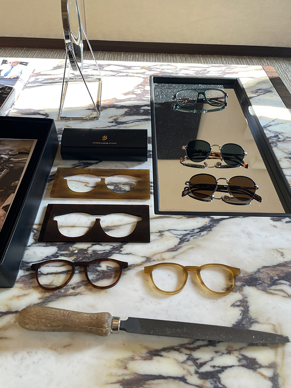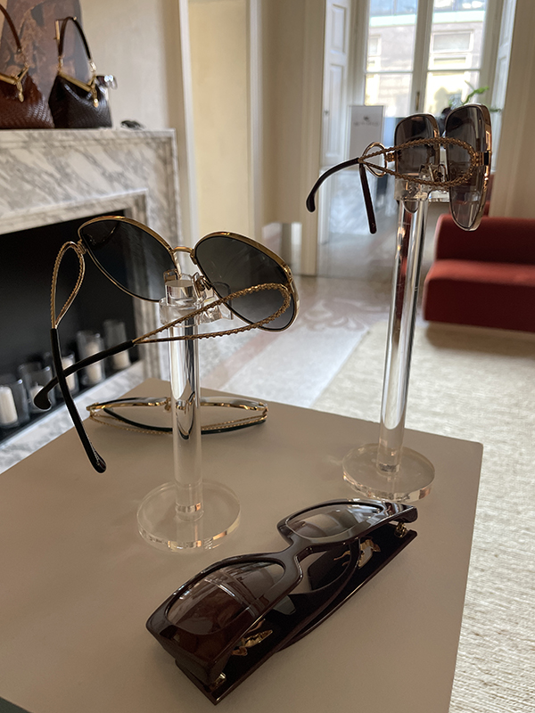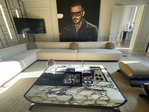Al centro dell’esposizione troviamo la linea Timeless, la più classica e raffinata, pensata per chi cerca un’eleganza senza tempo. Ai lati del salotto, invece, sono disposti i modelli della linea Pioneer, caratterizzati da profili spessi e audaci, impreziositi da un motivo stilizzato, il talismano, ispirato a un tatuaggio di Beckham stesso: ali di gabbiano, simbolo di protezione, libertà e avventura.