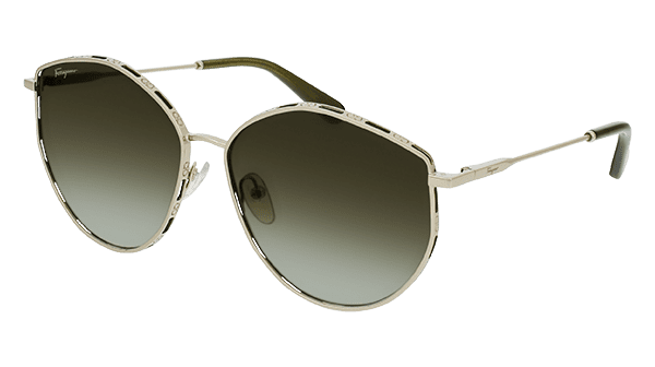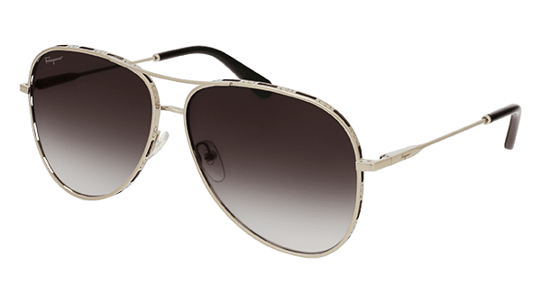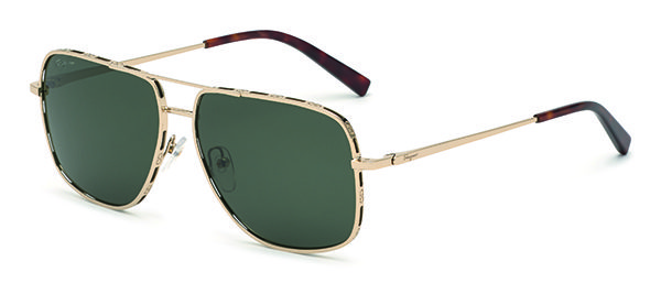 SF268S – L’esclusivo frontale di questa montatura da sole aviator è reso unico da un doppio ponte accostato a un ciliare in metallo sottile. Abbinati a lenti sfumate in diverse nuance, i cerchi Yellow o Rose Gold comprendono profili personalizzati dal tema Double Gancini alternato a fori decorativi che espongono le lenti. Le aste lineari e ultrasottili con logo Ferragamo sono animate da terminali in acetato coordinati al colore delle lenti.
