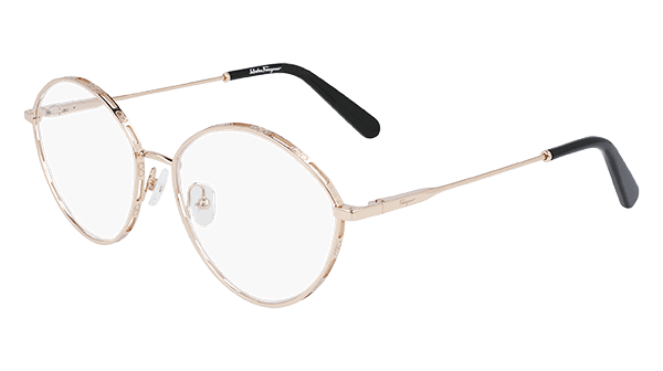 SF2209 – Questa montatura tea-cup coniuga un design contemporaneo con la più celebre icona di Ferragamo, il motivo Double Gancini, proposto sui profili Gold, Light Gold o Rose Gold e alternato ai fori decorativi che lasciano trasparire le lenti. Le aste lineari e ultrasottili sono caratterizzate dal logo Ferragamo inciso al laser e da terminali in acetato a contrasto. Il pattern Double Gancini, infine, eleva anche le alette regolabili.