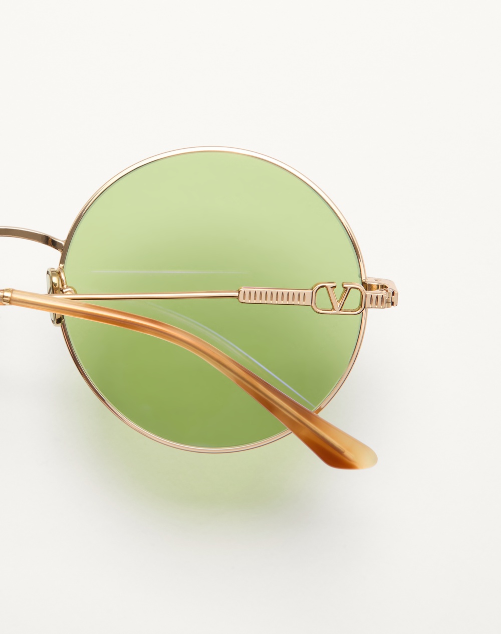 Questo modello presenta una forma rotonda oversize con aste sottili evidenziate dall’iconico logo V incastonato in eleganti lavorazioni. Realizzato in metallo leggero e rifinito con terminali delle aste in acetato, questo occhiale ha un design altamente versatile e sarà disponibile con lenti in una palette di colori di ispirazione vintage: verde scuro, ambra e verde chiaro.
