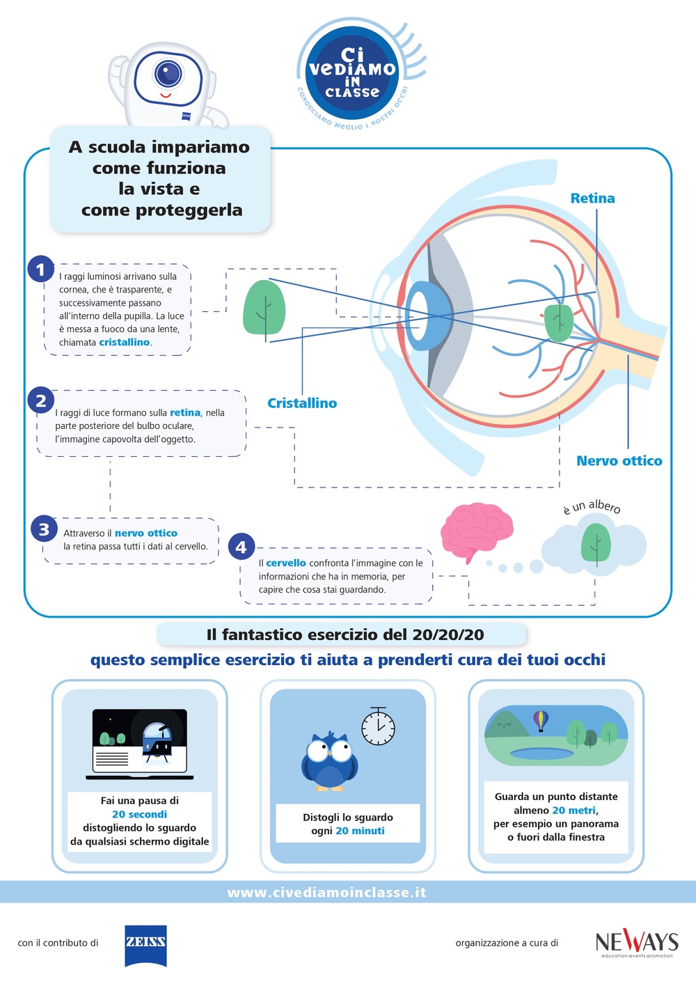 L’iniziativa è pensata per sensibilizzare bambini e ragazzi sull’importanza della salute visiva, portando informazione e prevenzione direttamente nelle aule. Tra la fine di settembre e l’inizio di ottobre verranno inviati nuovi kit educativi a circa 700 classi in 166 scuole già aderenti al progetto. Realizzati in collaborazione con Neways, questi kit in formato cartaceo illustreranno il funzionamento dell’occhio, i difetti visivi più comuni e forniranno suggerimenti per ridurre l’affaticamento degli occhi. (I kit in formato digitale verranno invece inviati alle scuole (diverse dalle 162 che già aderiscono) che ne faranno richiesta.